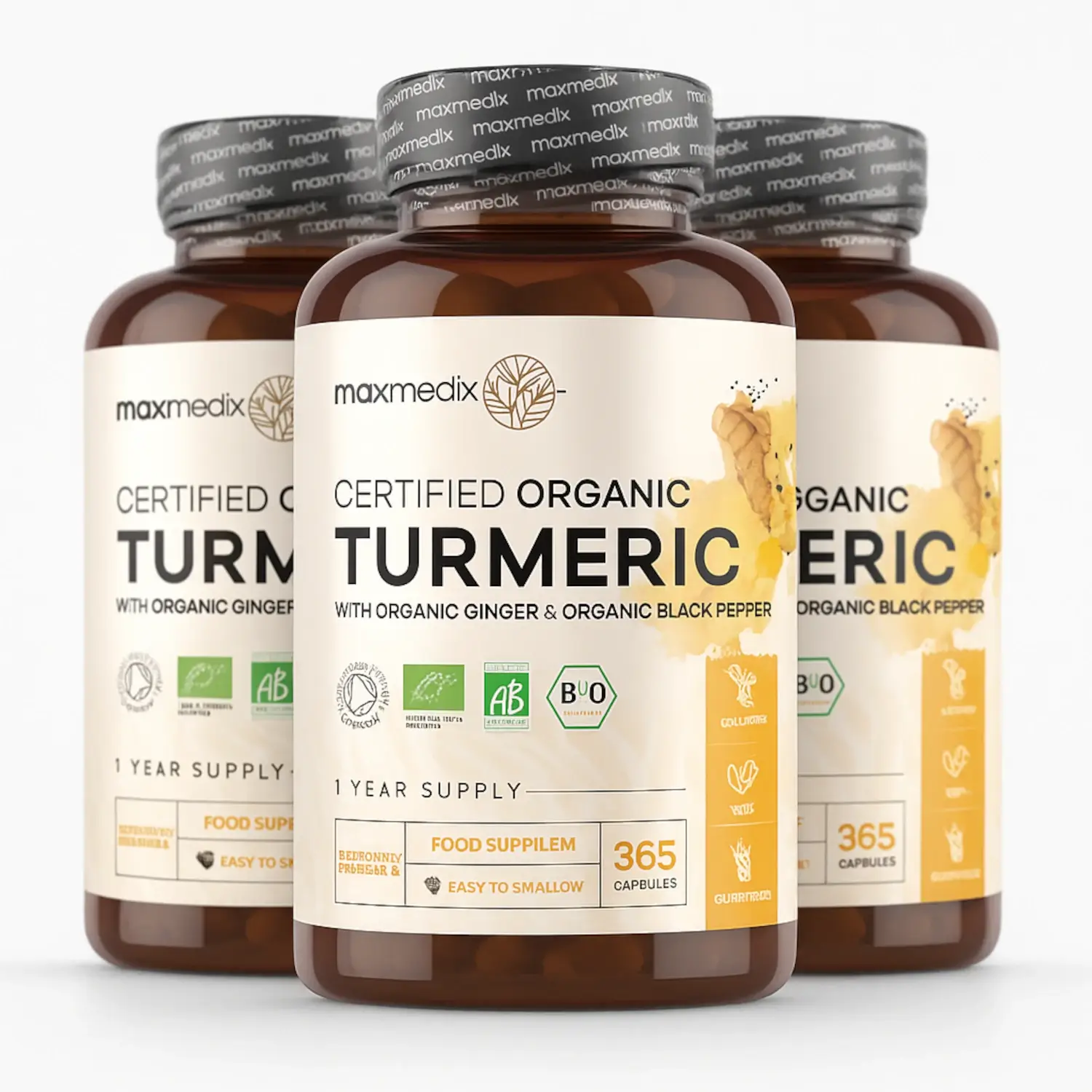 • 3 x Organiczna kurkuma z imbirem i czarnym pieprzem | 365 kapsułek | Suplement diety dla skóry i stawów
